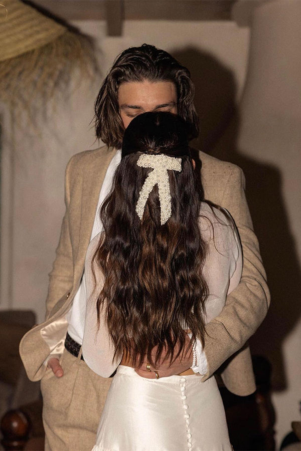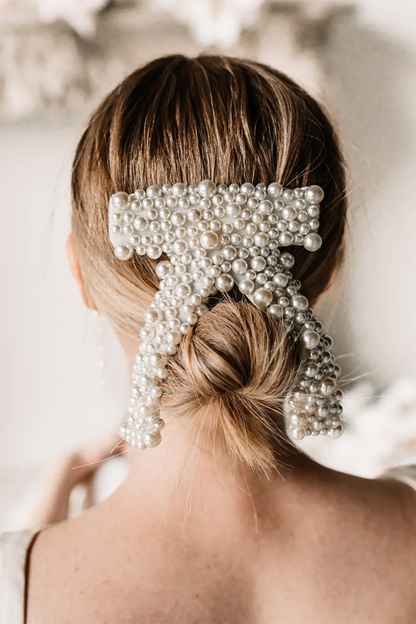Descubre Lía™, un broche rígido en forma de lazo cubierto de perlas. Perfecto para recogidos de novia, semirecogidos elegantes o cualquier evento donde busques un acabado impecable.
